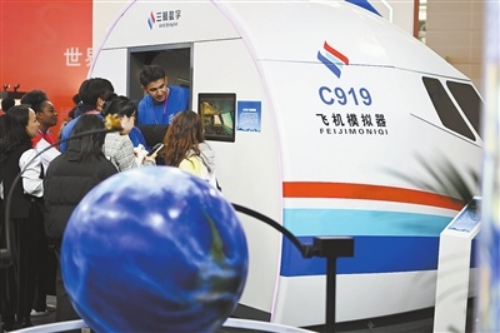 ▲2024年世界职业技术教育发展大会上,来自世界各国的参会者在职业教育专题展上参观C919飞机模拟器。资料图片
